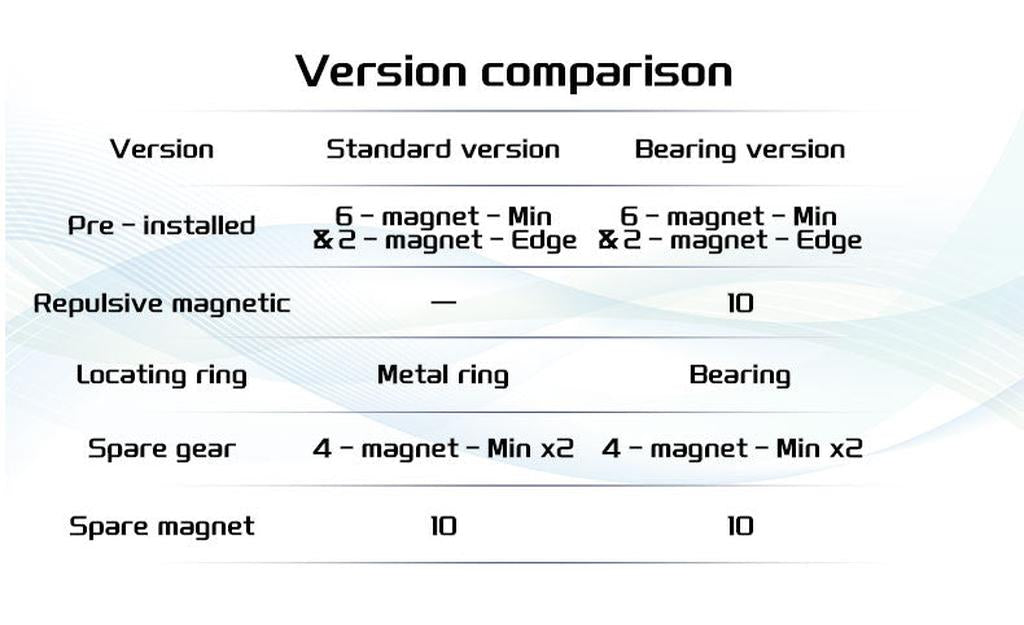 | Bearing You’re viewing this model | Yes | Magnetic positioning + adjustable configs + repulsion magnets (10) | Lowest resistance feel; optimized gears + bearing smoothness | Central magnetic ring helps prevent magnets from falling | 10 spare magnets | Maximum smoothness and speed with the most tunability |