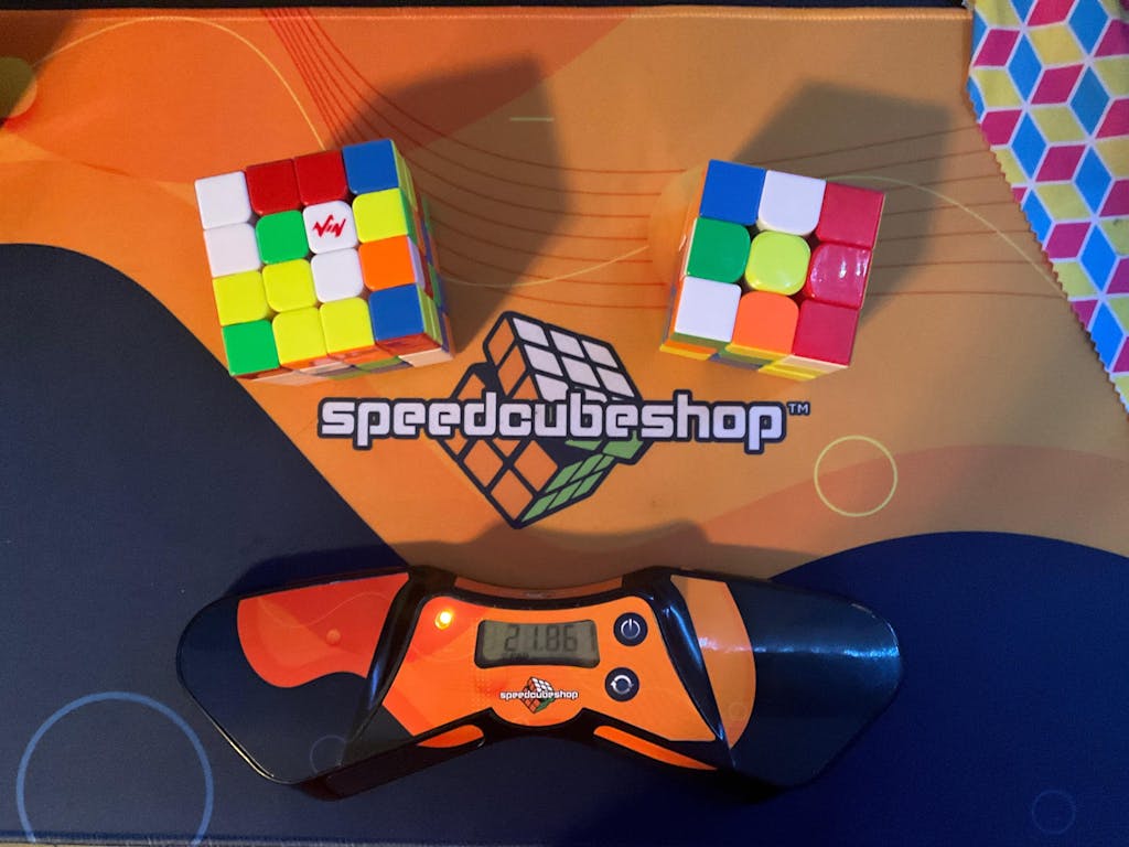 This mat is the best for my desk. It is about as big as my desk, and is much better than having a mini mat because now I don’t have to worry about my cubes landing outside of the mat. I also got the mini mat version for traveling and to stay in my cube bag. And a super cool extra is that it is the same pattern as my timer! Thanks Scs!!