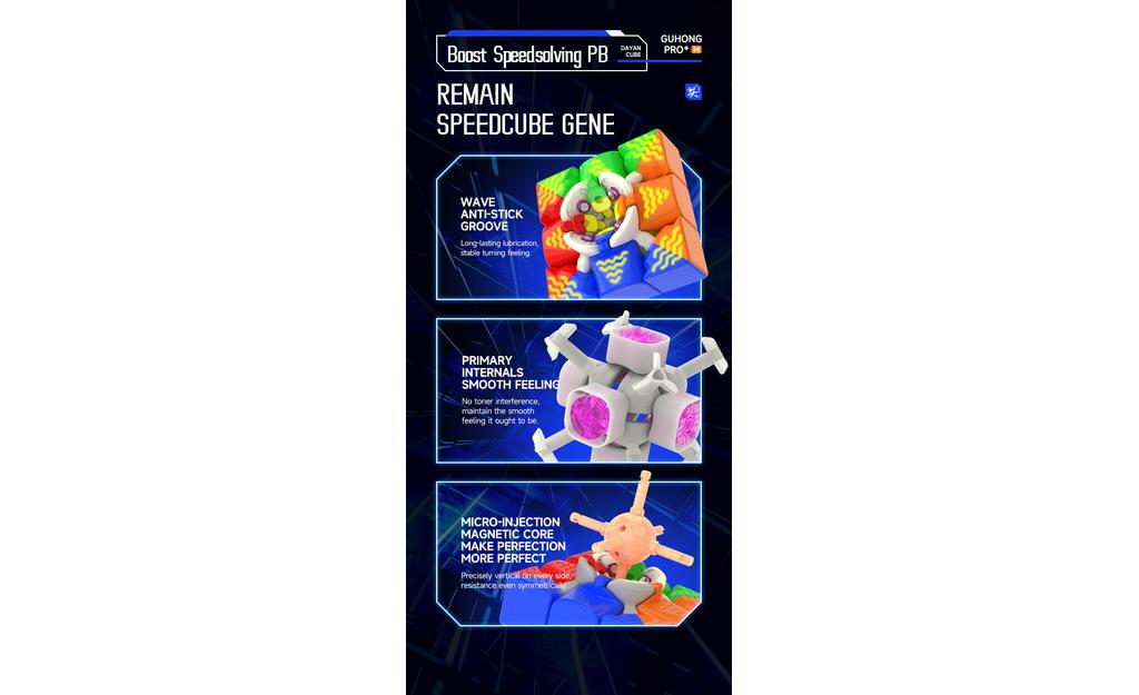 The DaYan GuHong Pro+ 3x3 (Magnetic, MagLev, Core Magnets) – 55mm is a flagship 3x3 speed cube that’s fast, stable, and easy to tune for any skill level. Piece magnets “click” layers into place for accuracy, MagLev replaces traditional springs with repelling magnets for a low-friction, ultra-quick feel, and core magnets add corner-to-core attraction for better layer alignment and control.