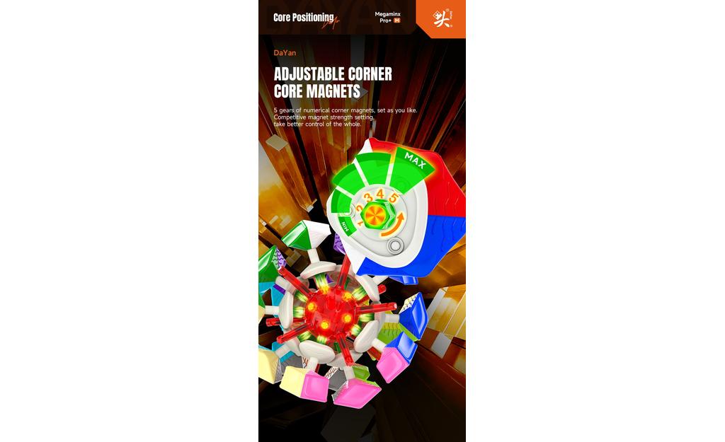The DaYan Megaminx Pro+ (Magnetic, Ball-Core) is a competition-ready megaminx speed cube designed to be fast, stable, and easy to tune for any skill level. Corner-to-core magnets in the Ball-Core system improve layer alignment, giving you a smoother, more controllable turning feel with fewer lockups—ideal for learning, practice, and WCA competition.