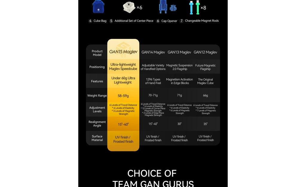 GAN 15 3x3 - 10th Anniversary Edition (Magnetic, MagLev, UV Coated) is the lightest flagship, weighing only 59g! While the GAN 15 is not as customizable as previous flagships, the focus is on performance and turning feel.