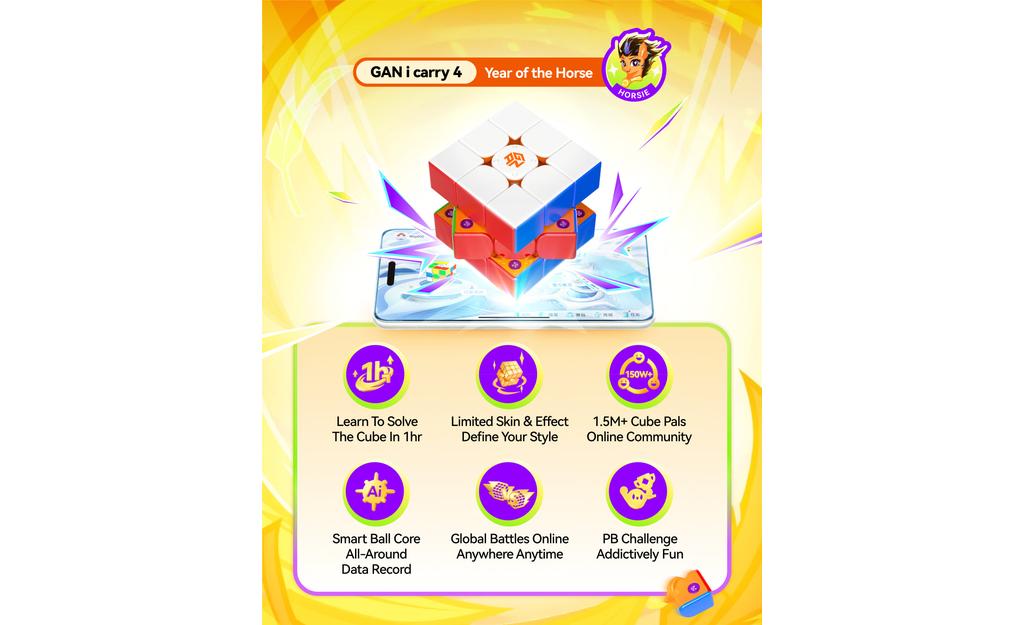 The GAN i Carry 4 3x3 (Magnetic) – Bluetooth Smart Cube is a beginner-friendly smart speed cube that pairs smooth, reliable hardware with app-powered training with a special Year of the Horse theme. It tracks every turn with zero-loss sensing using durable magnetic induction sensors, then visualizes your solves so you can see where you’re improving (and what to fix next). With 48 magnets for crisp alignment, a compact 56mm size, and a redesigned core that’s 19.9% smaller, it delivers steady, fast turns that feel controlled—whether you’re learning your first algorithms or chasing PBs.