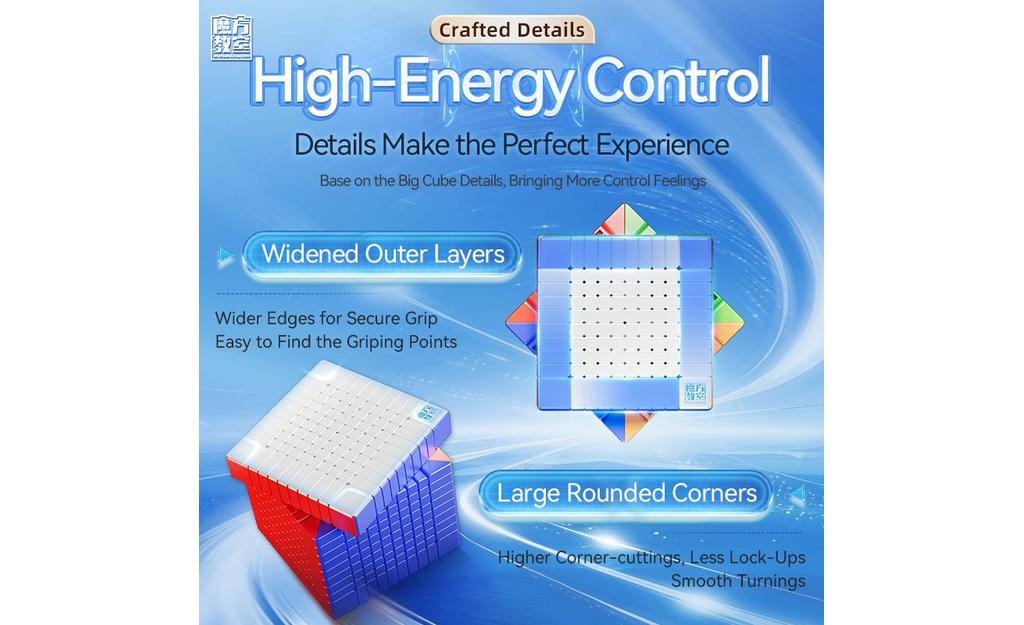 The MoYu MeiLong 10x10 V2 is an ultra-compact 10x10 speed cube built to make high-order solving feel smoother, lighter, and more manageable. With a 69.5mm size and a lightweight 215g build, it’s designed to reduce hand fatigue and keep turning more agile than you’d expect from a 10x10. A reinforced internal structure—secured by three concentric rings—plus an anti-pop mechanism and misalignment-resistant inner layers help the cube stay stable through long solves. Rounded corners support high corner-cutting, while widened outer layers improve grip and control when you’re turning multiple layers quickly.