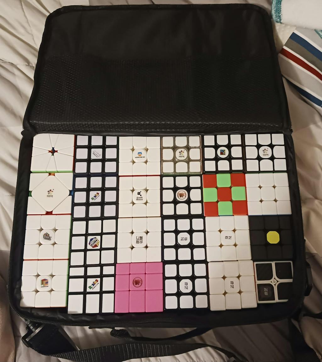 I fit 23 regular sized 3x3s and a 2x2 in this bag. It was a little too tight for my liking to cram in another 3x3, but I guess you can if you really try. I'm only using this bag as storage, not to take everywhere, so for me it works great. Nicely padded.