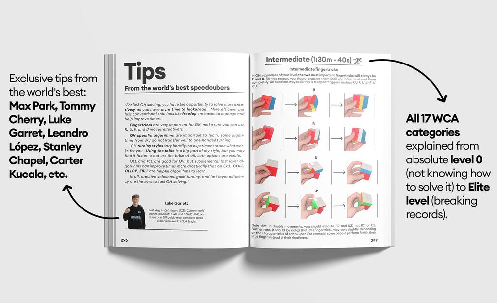 “What makes this book stand out is its structure, which seamlessly connects beginner fundamentals to advanced techniques, guiding you step by step, no matter your current level. With insights from top-level speedcubers and carefully curated information, it provides the resources you need to continuously advance in your cubing journey.”